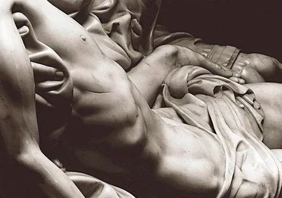 Despite the sculpture seeming balanced when viewed in front, viewing it from the sides shows how Jesus almost seems to be slipping off her lap. He is set to fall forward. Michelangelo’s Pieta was made as an altarpiece for the old St. Peter’s Basilica, meaning that it would be situated above the altar during Mass. If we imagine where the Body of Christ would come to rest after slipping from the Virgin’s arms, He would be on top of the altar. This small detail shows the power art has to reveal Truth: the Body of Christ and the Eucharist are one. Anyone who attended Mass seeing this altarpiece would be able to make this connection, this beautiful work was edifying as well as gratifying to behold. Another detail of the sculpture makes clear the Eucharistic significance of the piece: Mother Mary holds her Son, but her hand only makes contact with Him through the cloth of her veil. Her Son’s body is sacred and must be treated with reverence. The cloth reminds us of a priest's humeral veil, the cloth through which a priest lifts the monstrance during the veneration of Jesus in the Eucharist during Adoration. The Eucharistic significance of this piece is clear: the sacrifice is Christ, the Eucharist is His Body, Mary’s outstretched left hand offers Him to you.